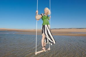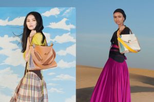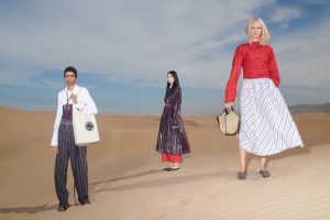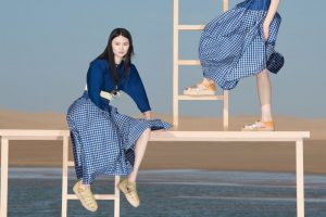 Há contrastes marcantes de cor, estampa e tecido. Chiffon e linho, jersey e bordado inglês; vestidos colados em piquenique e mantas Madras, listras projetadas e sólidas, e tops de jersey reversíveis com color block.