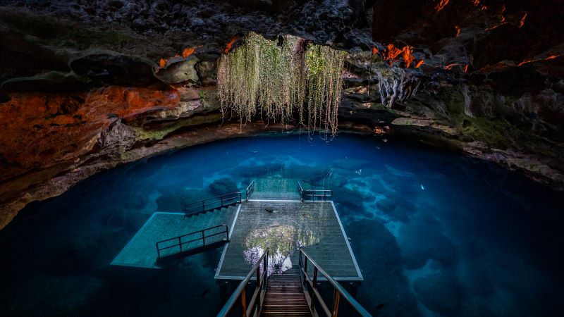 Inicialmente, a entrada para esta nascente subterrânea dentro de uma caverna pode passar despercebida, mas existe uma pequena escadaria que desce até um paraíso de águas azuis. A caverna pré-histórica tem um diâmetro de 36,5 metros à superfície e uma nascente com uma profundidade máxima de 16,5 metros, com acesso exclusivo para mergulhadores e praticantes de snorkel. Além da nascente, o local oferece área para camping e aluguel de cabanas.