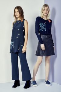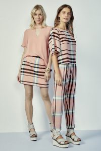 Tecidos fluidos para os vestidos amplos e tops. Estruturados na linha de alfaiataria. Hit – o esporte urbano. Peças de moleton ou malha – calças, tops oversize – usados com sofisticação. É o urban chic! Detalhes em dourado e bordados. Na temática folk, a linha hand made, com bordados especiais em tecidos naturais.