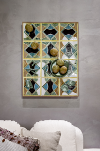 Outro destaque no ambiente é a escultura de Rodrigo Torres, um quadro em cerâmica que Bruno encontrou de passagem em uma galeria de arte. Para ele, a escolha foi impulsionada pela conexão pessoal imediata que sentiu ao vê-la, uma paixão à primeira vista que se alinha perfeitamente com o sentimento de criação do ambiente. Intitulado “Vovó preparando o lanche, pôr do sol de Outono, Minas Gerais”, o quadro de porcelana esmaltada sobre chassi de madeira evoca um sentimento de nostalgia e memória afetiva, reforçando a importância dos ciclos da vida e das histórias pessoais.