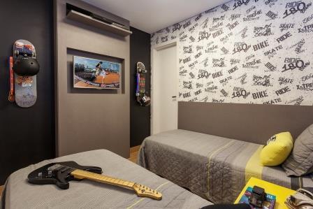 A base do quarto é neutra e em tons de cinza. O destaque fica por conta do papel de parede com o tema: esportes radicais; uma paixão em comum entre os irmãos. Foto: Jomar Bragança
