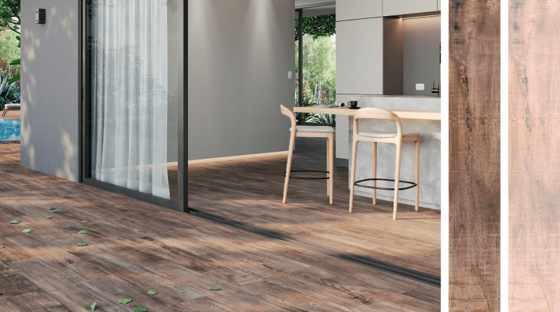 A madeira é um excelente material atérmico: não é quente no calor, nem gelado no frio, perfeito para andar descalço! O porcelanato da Série Campestre, da Incepa, une a textura da madeira com a praticidade para o dia a dia. Disponível nos tons Café e Creme, no formato 20×120 cm, o revestimento realça os veios e os detalhes da madeira, assegurando um visual aconchegante para a prática de atividade física | Foto: Divulgação Incepa