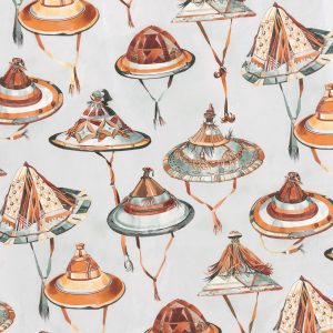 As estampas da nova coleção têm cores e uma luminosidade que parecem deslizar no tecido, esticadas pelo pincel. Estes traços nutrem o contorno delicado de um chapéu feito à mão, inspirado nos cocares cerimoniais da tribo Dogon. A impressão digital reproduz a sutileza das nuances, os efeitos da transparência, da dupla passagem do pincel. O movimento elegante da pluma, os detalhes do adorno, sublimes, parecem ter sido pintados instantaneamente.