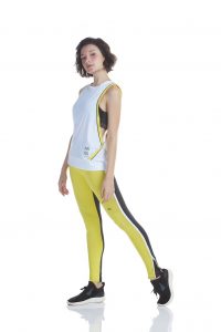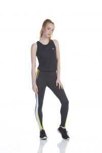 As opções disponíveis para as amantes dos esportes são leggings, regatas, tops, shorts, t-shirts e um macacão que aparece em uma modelagem diferenciada – parte inferior ajustada ao corpo e parte superior soltinha –.
