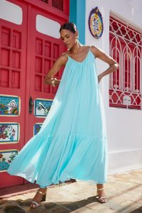 Shapes amplos, leves e cheio de movimento aparecem em saias, vestidos, shorts, tops, camisas e blazers. Nos tecidos, a mistura de crepe, cambraia de linho, tricoline, bio whased, malha canelada, laise, organza, rechelleu, tricot e o new denim, que é uma mistura do jeans com linho, passeiam bem do casual ao formal, criando uma atmosfera easy chic na produção.
