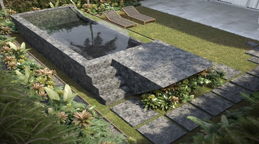 Diferente de tudo o que o mercado de arquitetura já viu, o visual da piscina remete a um pequeno barco de papel flutuando, que fascina e instiga a curiosidade. Em um perfeito equilíbrio, o aspecto firme do revestimento Matrix 3D intensificado, da Super Clássico, surge como um casco de navio escuro e traz a percepção de força e resistência. A pedra rara é um revestimento exclusivo das piscinas UNLIMITED.