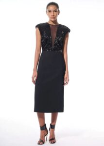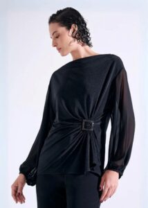 Se a intenção é atrair olhares, o all black com toques brilhantes é uma forma poderosa de transformar o visual. Tecidos como vinil ou couro envernizado trazem um ar futurista e moderno à produção. Outra forma de incorporar brilho é com paetês ou peças com acabamento cintilante, que funcionam especialmente bem em looks noturnos. A monocromia permanece, mas com um toque de impacto visual e personalidade.