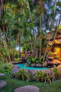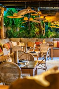Com assinatura da conceituada arquiteta Sara Romano Afonso, a decoração do espaço atua como uma forma de conexão com a culinária apresentada. Suas luminárias são de fibras naturais, como rattan e palha, 100% feitas a mão com artesãos da Indonésia. Além das peças provenientes do país asiático, há produções de artistas locais. Localizado em um grande jardim arbóreo no Quadrado e com uma linda cascata em seu espaço, o ambiente – diferente de tudo que é encontrado na cidade – proporciona uma imersão total com a natureza, ideal para quem busca privacidade e reconexão.