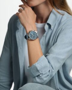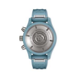 Pela primeira vez a aplicação de uma cor Pantone® é feita em um relógio da IWC Schaffhausen fabricado em aço inoxidável. O cronógrafo apresenta mostrador e pulseira na tonalidade azul TOP GUN Miramar, além de ponteiros banhados a ródio preenchidos com Super-LumiNova®, que garantem excelente legibilidade.