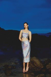 Com base nas comemorações de Natal e Ano Novo, todos os itens caminham em uma cartela em tons de off white, bege, dourado, prata, rosé e bordô. Dentre todas as novidades, o destaque especial está nos dois conjuntos de top e saia desenvolvidos em brocado e em paetê, que se evidenciam pelas suas ricas texturas.