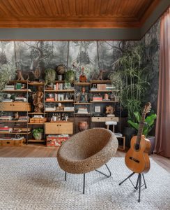 “A MPB sempre esteve presente na minha história. Desde muito pequeno, eu recordo dos discos de vinil tocando nas festas que meus pais davam ou, simplesmente, quando eles ouviam em casa. Maria Bethânia, Gal, Chico, Caetano, entre outros fazem parte da minha criação”, afirma o profissional. Assim, ele projetou um espaço surpreendente com muitas referências.