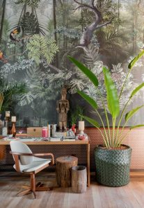 Nesse cenário exuberante, as combinações são especiais. Um dos destaques é o lambri em meia parede com o revestimento Treliça BW Matte, criado pela Isabela Capeto para a Ceusa. Uma das mais conceituadas estilistas brasileiras, ela teve sua estreia no segmento de arquitetura e decoração através dessa parceria. As coleções de porcelanatos assinadas pela profissional trazem a sinestesia entre os universos das passarelas e do design de interiores, celebrando o artesanal, a cor e a valorização da cultura brasileira. Um casamento perfeito entre conceito e aplicação!