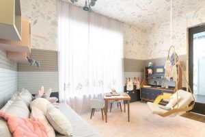 O ponto de partida para a criação do espaço da arquiteta Leila Bittencourt foi o papel de parede Outono, uma estampa inédita da marca que foi utilizada nas paredes e no teto do espaço. Nuances de azul compõem as paredes, os móveis e decorativos do ambiente, uma brincadeira que a arquiteta utilizou para trazer leveza e conforto, podendo ser um quarto para meninos como meninas. Já a poltrona suspensa, traz toda a diversão para o ambiente. “Todos os objetos decorativos foram produzidos pela Petit Retro, que trazem um toque artesanal, de produzido à mão, que é uma tendência que todas as mães e crianças gostam, pois encantam”, acrescenta a arquiteta.