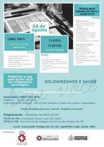 A Associação dos Amigos do HC, em parceria com o Complexo Hospital de Clínicas e a Universidade Positivo, promove, no dia 24 de agosto, o evento Seja Você – Solidariedade e Saúde, com profissionais de renome que irão realizar palestras, consultoria de imagem, maquiagem e hidratação da pele, entre outras atividades. O encontro é voltado para pacientes de tratamento oncológico, cuidadores, familiares e acompanhantes de tratamento, além de profissionais da área de saúde.