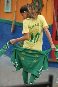As t-shirts com corte V e as blusas de manga comprida nas cores da bandeira nacional podem compor um conjunto básico e demonstrarem o verdadeiro espírito das apreciadoras de futebol. Já a jaqueta bomber com gola alta e babados nos ombros unida à legging com pezinho transformam a combinação em algo descontraído e esportivo.