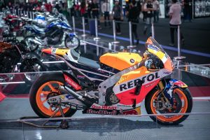 Um dos destaques no estande da Honda é a RC213V, moto campeã do MotoGP pilotada pelo espanhol Marc Márquez, que possui seis títulos do campeonato mundial de motovelocidade. O motor explora a potência máxima e permanece durável durante as 19 corridas da temporada. Já a suspensão mantém o pneu em contato com o solo e produz aderência máxima para aguentar solavancos e ondulações. Enquanto isso, a carenagem leve de fibra de carbono desempenha um papel importante ao tornar o modelo o mais aerodinâmico possível.