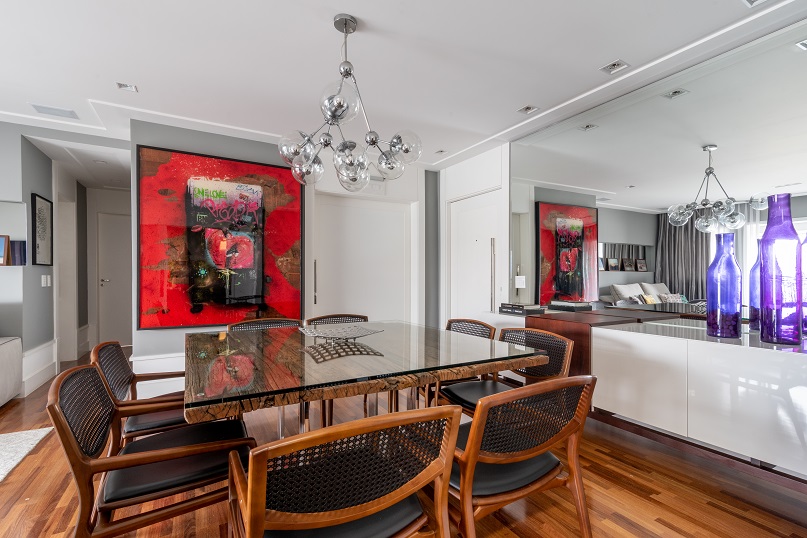Com visual leve e translúcido, o aparador sob medida de vidro é um dos destaques da sala de jantar assinada por Isabella Nalon junto de Juliana Atti e Sula Miranda | Fotos: Júlia Herman