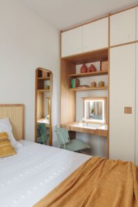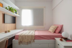 Nos quartos, a marcenaria é protagonista: armários, mesas de estudo, penteadeiras e até camas sob medida garantem aproveitamento total do espaço. No banheiro social, a paginação descontraída dos revestimentos e a ampliação do vão da janela aumentam a entrada de luz natural. Já na suíte principal, uma solução multifuncional reúne armário, estação de trabalho e porta de correr para ocultar a TV. A cama, também personalizada, se integra visualmente à cabeceira e às mesinhas de apoio.