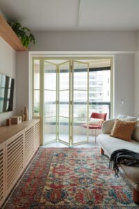 Na sala, o layout foi revisto para incluir um terceiro quarto, atendendo ao desejo das filhas por mais privacidade. O mobiliário leve e as cores suaves equilibram a redução de espaço, enquanto um rack desenhado sob medida valoriza um pilar de concreto aparente — elemento que a cliente fazia questão de destacar. A varanda foi integrada à área social, mas pode ser isolada pela porta camarão projetada pelo escritório. O móvel contínuo, que se estende entre os dois ambientes, ainda cumpre a função de esconder a condensadora do ar-condicionado.