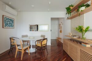O ponto de partida foi a preservação e restauração do piso de madeira original, que manteve viva a memória afetiva do espaço. A cozinha, antes escura e pouco convidativa, ganhou revestimentos claros e uma janela tipo passa-prato em serralheria, permitindo que a luz da sala se espalhasse pelo ambiente. Marcenaria sob medida, mais espaço de armazenamento e novos pontos de apoio tornaram a rotina mais prática, conceito que também se estendeu à lavanderia para manter fluidez e unidade visual.