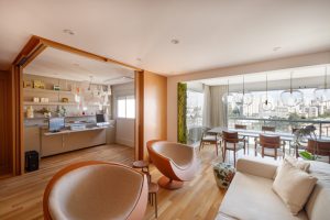 Um apartamento confortável para viver e receber a família, com um toque de aconchego, conta com materiais que remetiam à antiga casa
