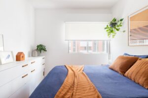 No quarto do casal, a proposta foi trazer aconchego e funcionalidade, com mobiliário que facilita o dia a dia sem perder o estilo. O escritório, por sua vez, foi concebido como um espaço leve e inspirador, perfeito para momentos de trabalho e estudo, com iluminação natural e pontos de destaque decorativos que reforçam a personalidade do apê.