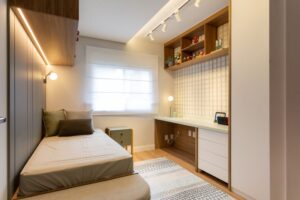 O resultado é um lar que valoriza a rotina da família. A cliente, por exemplo, realizou o sonho de ter um escritório — depois de trabalhar anos em um canto improvisado na lavanderia. Os filhos ganharam quartos com personalidade: Guilherme com céu estrelado e uma pegada moderna em verde; Olivia com um mundo delicado em rosa, azul e papel de parede floral. Tudo pensado nos detalhes, como o tapete de bolinhas, a penteadeira evolutiva e os efeitos de iluminação.