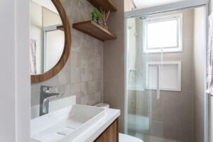 A suíte master exala aconchego com cabeceira iluminada, arandelas cinzas e armário em L bem resolvido. Já os banheiros trazem composições harmônicas entre tons neutros e pontos de cor, além de soluções práticas como nichos, armários espelhados e metais cromados ou dourados, dependendo do ambiente.