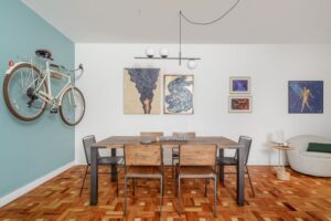 A relação dos moradores com arte, livros e ciclismo acabou se tornando o fio condutor do projeto. “Eles têm um carinho muito grande por suas bicicletas, então deixamos uma delas exposta na sala, numa parede verde água que remete às propagandas dos anos 70, quando essa cor era usada para transmitir frescor e otimismo em tempos de reconstrução”, explica Júlia Otaga. A bike, com acabamento off-white e estética vintage, virou quase uma escultura dentro do apartamento.