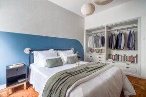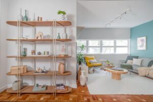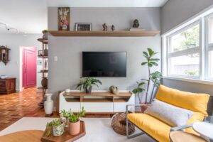 O imóvel, que já tinha o piso original de taco de madeira bem conservado, precisava apenas de uma nova abordagem para ganhar leveza e personalidade. O casal, que trabalha de forma híbrida, pediu soluções práticas para o dia a dia, incluindo dois espaços de home office. Como eles não têm filhos, a configuração dos três quartos foi adaptada: um virou dormitório e os outros dois foram dedicados ao trabalho remoto.