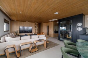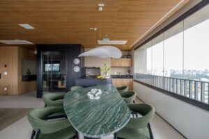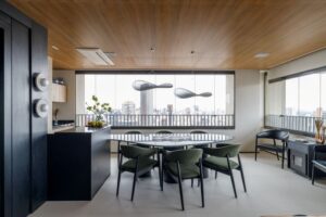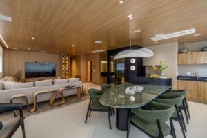 O forro em madeira aquece visualmente os espaços e cria unidade estética, enquanto a iluminação valoriza texturas, volumes e proporciona diferentes atmosferas ao longo do dia. O uso de tampos e mobiliário com formas orgânicas traz suavidade ao layout, reforçando a fluidez tão desejada. A adega walk-in, estrategicamente posicionada no centro da área social, se tornou um dos principais destaques — um elemento que combina impacto visual, funcionalidade e sofisticação. A automação completa do apartamento permite controlar luz, som, climatização e cortinas com praticidade e precisão, elevando a experiência cotidiana.