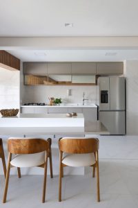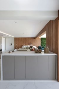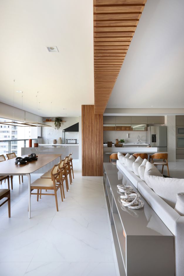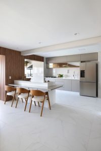 Também unida à sala e à varanda, a cozinha recebeu uma península com bancada, que serve para as refeições rápidas no dia a dia. A adega ganha destaque na transição para o home theater que tem sua estrutura alternada entre os acabamentos madeirados e laqueado.