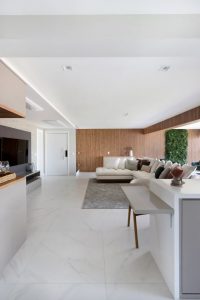 Outra alteração estrutural foi a retirada da caixilharia que dividia o living e a varanda gourmet, que hoje recebeu um lindo jardim vertical trazendo vida ao ambiente. A Viga e o pilar remanescentes foram revestidos por um sofisticado painel ripado de madeira, com dose extra de conforto ao conjunto social.