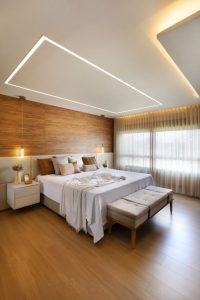 O moderno projeto luminotécnico destaca a iluminação indireta em sancas, painéis e cortineiros, além de imponentes pendentes decorativos na sala de jantar da varanda, acima das mesinhas de cabeceira da suíte máster e no hall de entrada.
