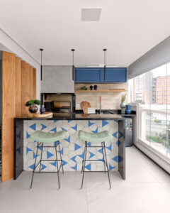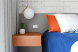 O projeto também se destaca pela curadoria de fornecedores e mobiliário. O tijolinho aparente é da Pallimanan, enquanto a marcenaria sob medida foi executada pela Cubbus Marcenaria. O piso em porcelanato leva assinatura da Portobello, as cadeiras e o sofá são da Lider Interiores, e o buffet complementa a área social com design da Tok&Stok. O projeto luminotécnico conta com peças da Yamamura, arandelas da Lumini e rodapés da Santa Luzia, enquanto os objetos decorativos, que reforçam a personalidade jovem e despojada do apartamento, são da Black Angel e GP Life Decor.