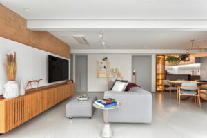 Outro recurso arquitetônico marcante foi a padronização das portas na área social. Todas receberam pintura em tom de cinza e puxador cava esculpido, revestido em folha natural de freijó, criando unidade visual e elegância. Já a porta de acesso à área íntima corre embutida por dentro da parede, posicionada discretamente atrás do painel de TV em tijolinho, reforçando a sensação de continuidade espacial.