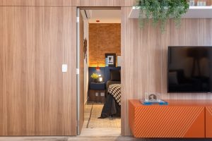 O painel de madeira, com a porta mimetizada, resguarda a entrada para o dormitório do morador | Foto: Estúdio São Paulo