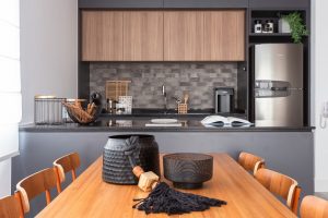 Como apoio extra para a bancada, a cozinha também conta com uma ilha. A mesa de jantar, por sua vez, explora a madeira e tem cadeiras com estofado laranja.