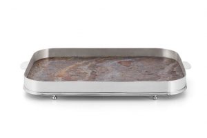 St. James — Bandeja com galeria Cross Oblonga e fundo de pedra e madeira, com acabamento em prata, níquel, cobre, grafite e gold 24k. Medidas: c: 58 cm / l: 41 cm / h: 6 cm.