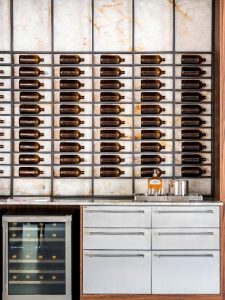 Evviva Moema — Marca de mobiliários planejados de alto padrão, combina madeira, metal e pedra natural. Oferecendo soluções em projetos personalizáveis, esta adega traz painel translúcido de pedra com iluminação interna.