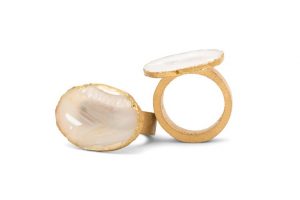 Casa Valli – À esquerda, conjunto de quatro prendedores de guardanapo em metal e madrepérola. À direita, conjunto de seis sousplat de polipropileno, com aparência de pedra natural.