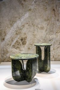 Brasigran – Mesas Quartz, assinadas por Luciano Santelli, feitas com sobras de Quartzito Vitória Régia. As criações foram expostas na última edição do Salão do Móvel, em Milão.