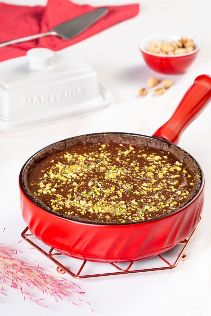 MODO DE PREPARO: Em um processador triture as bolachas. Adicione a água, a manteiga e bata novamente. Forre o fundo de uma frigideira Ceraflame com a massa de biscoito e leve para gelar por 20 minutos. Asse em forno pré-aquecido a 180º por 15 minutos e deixe esfriar. Derreta o chocolate e adicione o creme de leite, mexa bem. Adicione 150g de pistache e misture novamente. Cubra a base com o creme de chocolate e, por cima, salpique o restante do pistache quebrado. Leve para gelar por pelo menos 1h antes de servir. Leve a frigideira à mesa e surpreenda!