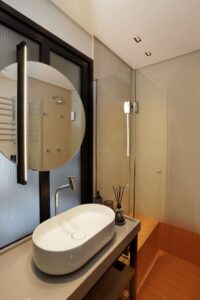 O banheiro colorido também foi um dos destaques do projeto. Com tons que contrastam delicadamente com a paleta neutra do restante do ambiente, ele traz uma explosão de cor que revitaliza o design do espaço. Uma janela aberta entre o banheiro e o restante do studio permite que a luz natural penetre, iluminando o ambiente e criando um efeito visual que é, ao mesmo tempo, funcional e surpreendente.