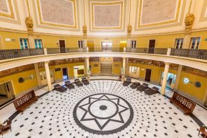 Sua arquitetura faz referência às antigas termas romanas e a entrada principal apresenta vitrais que ilustram trechos da história da cidade. Entre eles, os painéis de Genesco Murta. O piso em mármore, ao centro, possui uma mandala de oito pontas, com 30 metros de cobre abaixo da superfície, com a finalidade de reenergização para quem se senta em seu ponto central.