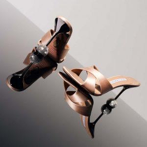 A marca lança três modelos de sapatos icônicos: a mule aberta Yes Darling, o scarpin aberto Nights Pump 95 e o Parisien, que aparece em dois diferentes estilos – sandália e mule. Em comum as peças possuem uma esfera repleta de cristais no salto, que remete a um globo de discoteca. A Nights Pump 95 tem shape futurista: é feita em PVC, deixando quase todo o pé a mostra. Uma exuberante ponteira de cristais e amarrações em couro que sobem pelo tornozelo fazem desta peça, um statement. A Yes Darling é uma sandália acetinada e muito confortável, enquando a Parisien é toda feita em couro, com tiras finas que adornam os pés e disponível na versão mule e tamanco, sempre com os globos brilhantes no salto.