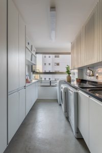 Nesse apartamento realizado por Júlia Guadix, a lavanderia é uma extensão da cozinha. Para separar os dois ambientes, a arquiteta trabalhou com uma marcenaria planejada para armazenar produtos de limpeza e outros itens | Foto: Guilherme Pucci