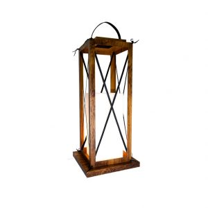 O corredor recebeu uma luminária de piso em madeira, no estilo lanterna, repleta de charme|
