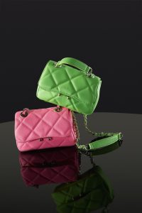 As bolsas possuem shapes modernos e atuais, visando estilo e praticidade em perfeita sintonia. As bolsas tiracolo, bucket e tote acompanham a mulher em todas as ocasiões, com destaque para o couro nappa glow com toque macio, que reforça a sofisticação e leveza da peça. Um clássico do guarda roupa feminino, o matelassê aplicado ao couro em conjunto com alças feitas em correntes são uma forte tendência para a estação, sendo o trabalho em couro reinterpretado em tons de NEON em conjunto com um visual mais acolchoado, trazendo causalidade e modernidade para códigos clássico da moda.