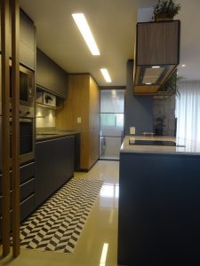 “O propósito do projeto foi criar ambientes práticos, funcionais, que se encaixassem no perfil e estilo de vida dos clientes: um casal jovem, sem filhos e com muito bom gosto, buscando uma linha mais contemporânea – conceito utilizado em todo o apartamento. Não fizemos alterações de revestimentos ou forro de gesso, preferindo realizar arquitetura de interiores com projeto luminotécnico, marcenaria e ambientação”, explica a profissional.